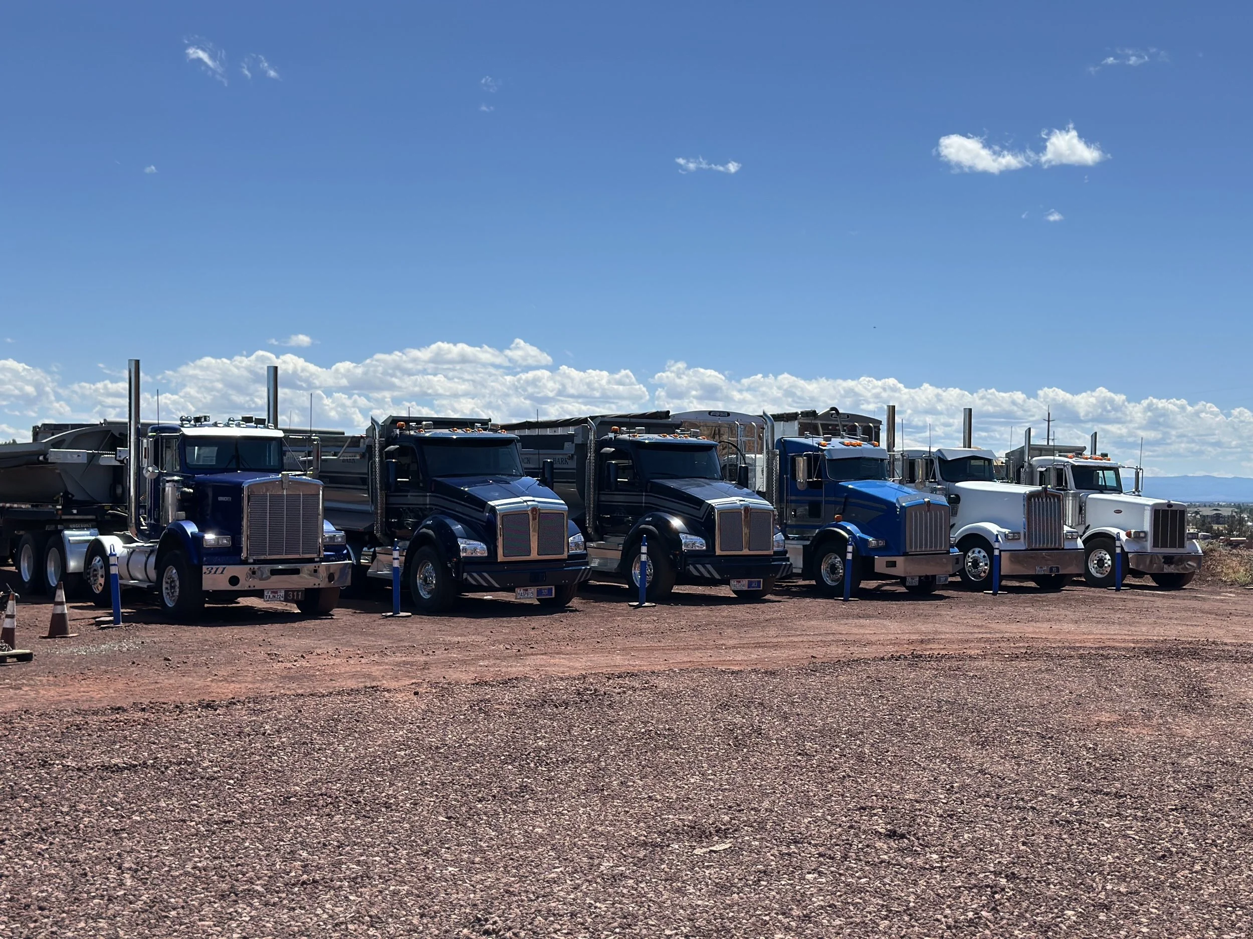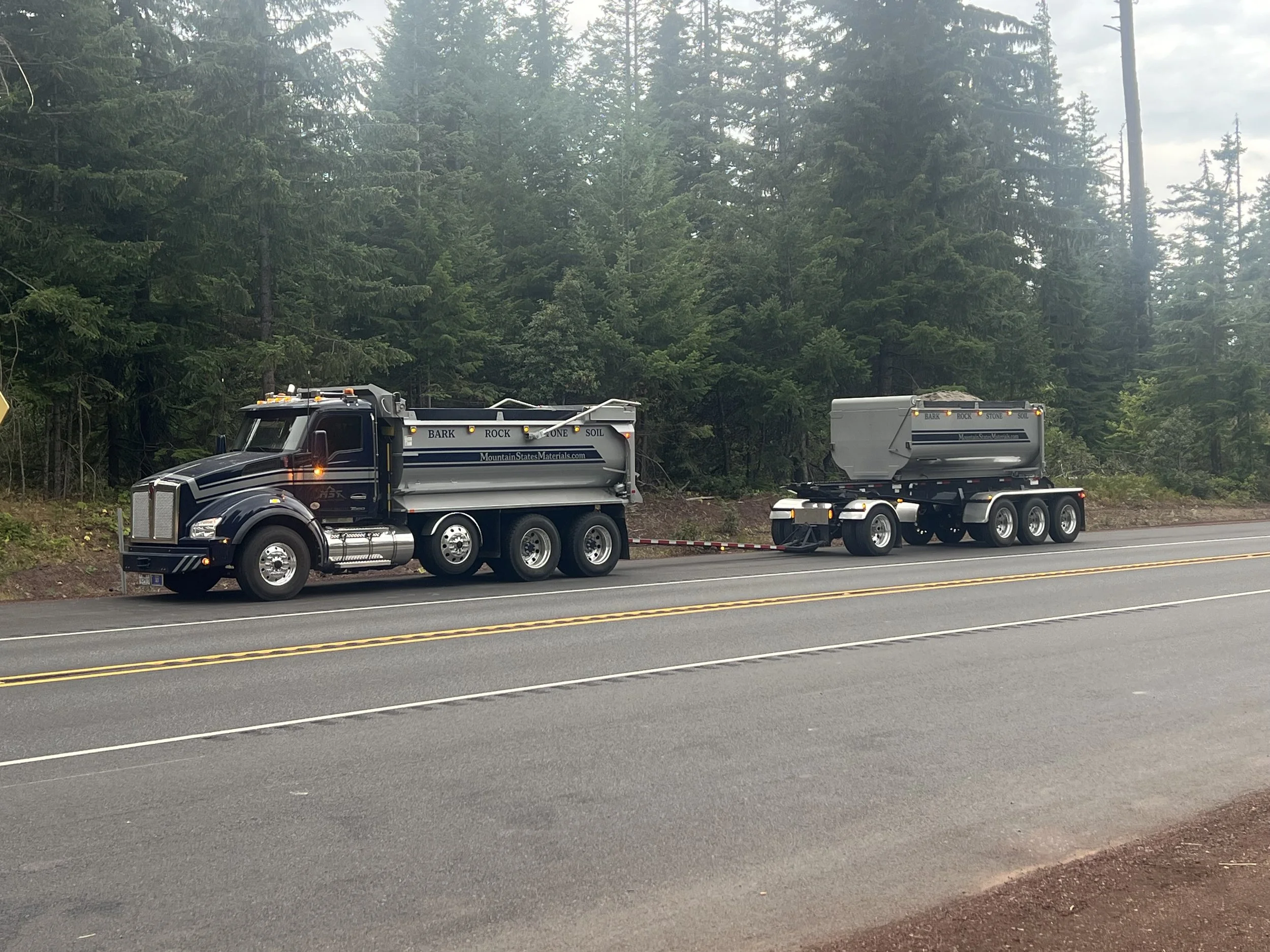 This is the biggest bang for the $buck$. This truck and transfer can deliver up to 24yds of 3/4- or 30yds of most of our other material. Don’t worry, the trailer doesn’t dump…Once the truck has dumped, it will go back to where the trailer was unhooked and grab just the TRAILER BOX..taking up no more space than a solo dump truck.